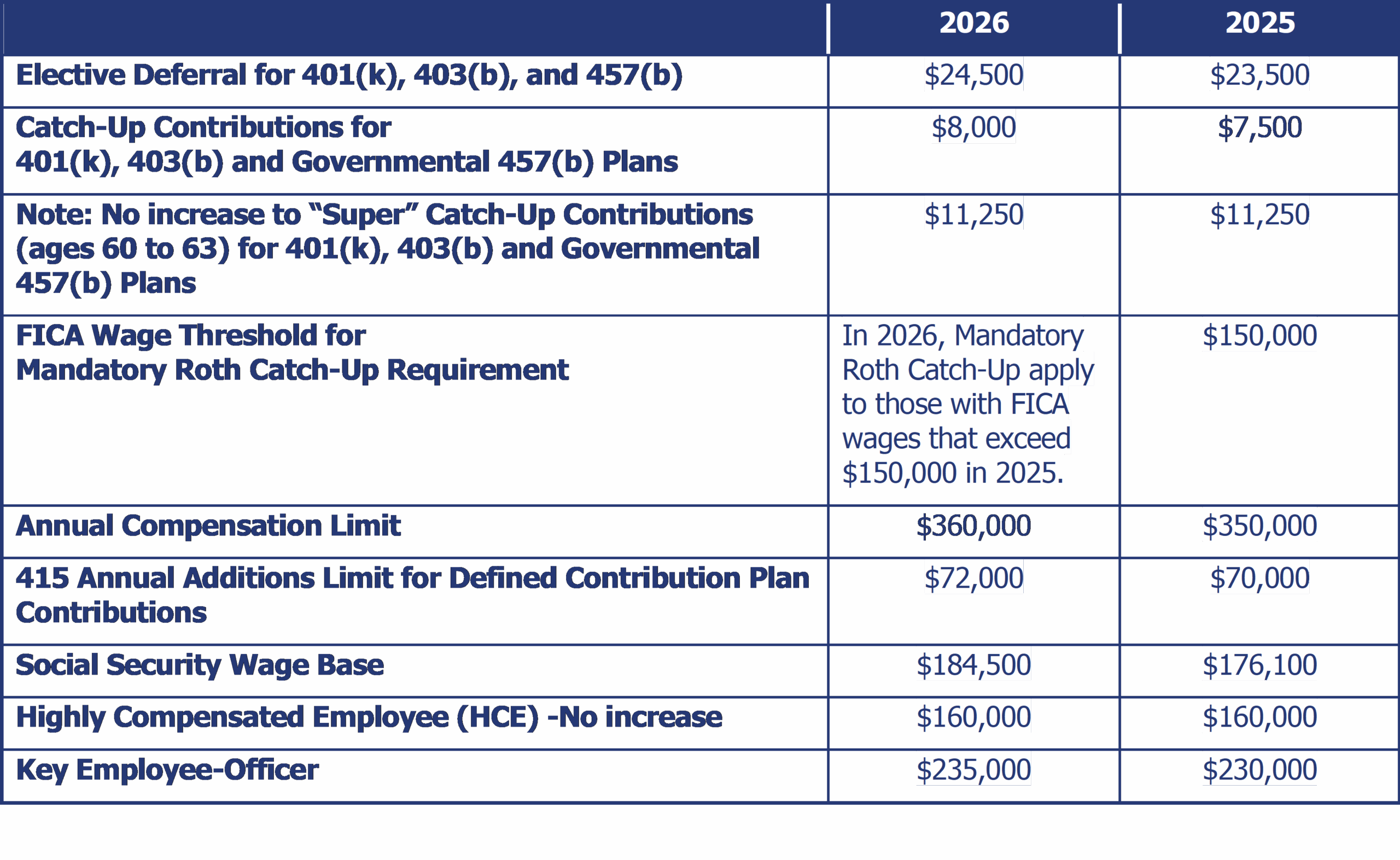The Internal Revenue Service (IRS) released the 2026 cost-of-living adjustments (COLA) for retirement plans on November 13, 2025, under Notice 2025‑67. As we welcome in the New Year, these updates reflect multiple increases to key limits previously applicable in 2025.