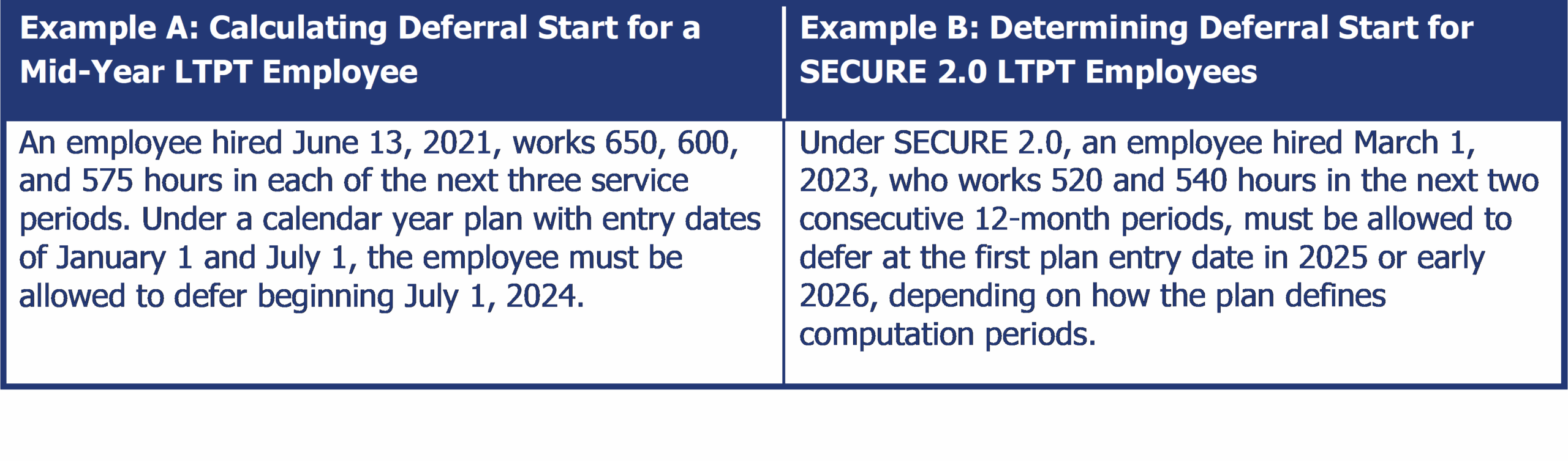 - SECURE 2.0 Act of 2022: Shortened the service requirement to two consecutive 12-month periods starting in 2025 and extended the rule to ERISA covered 403(b) plans.