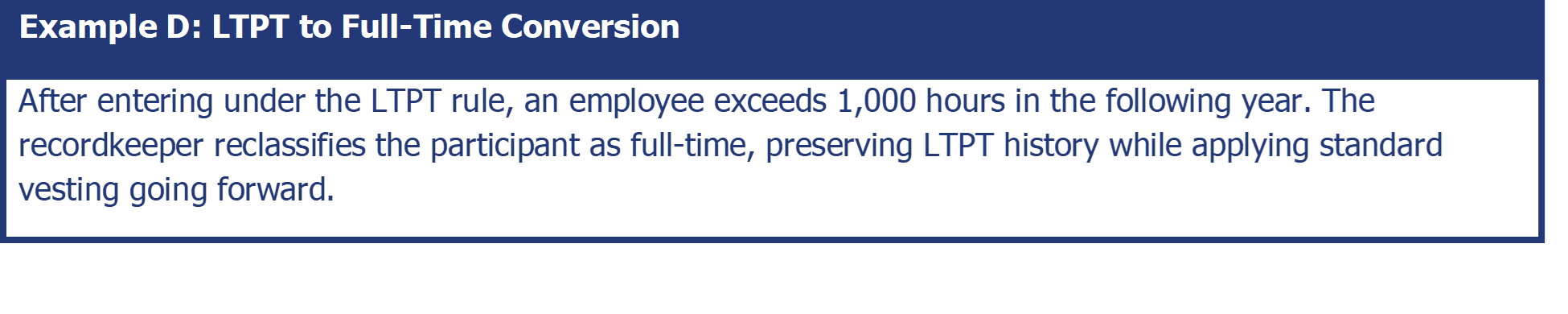 The legislation defines how LTPT employees enter the plan, but not how they “graduate” to full-time. Recordkeepers must therefore define operational triggers that transition participants cleanly between categories.
