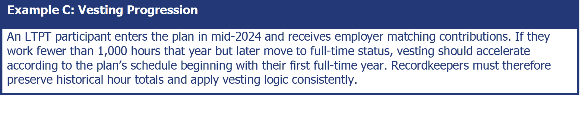 This example demonstrates the importance of accurately capturing prior LTPT service so that employees receive proper vesting credit once they become eligible for employer contributions, while maintaining audit ready records.