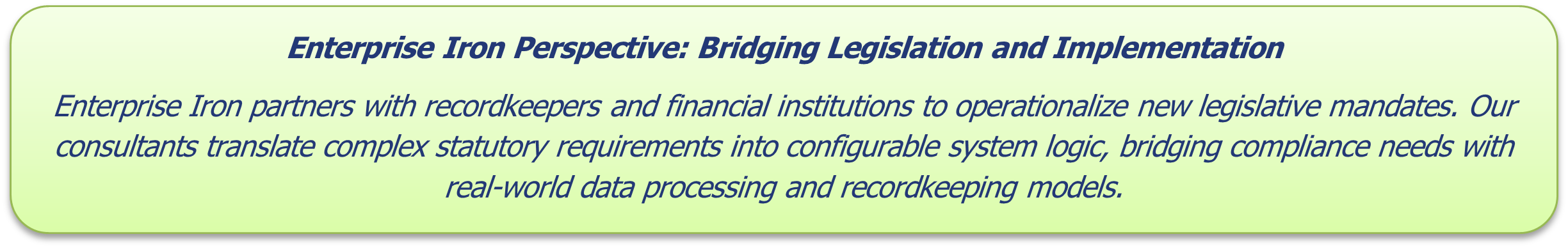 Throughout, we highlight how Enterprise Iron helps financial institutions and recordkeepers bridge the gap between regulatory language and system implementation, ensuring compliance, scalability, and operational efficiency.