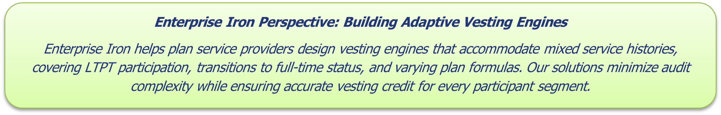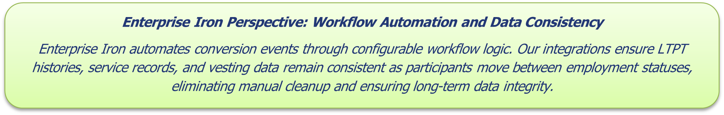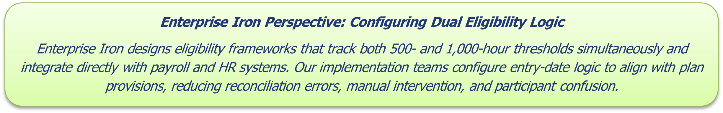 For recordkeepers, this introduces an entirely new service tracking path that operates in parallel with traditional eligibility and vesting rules. The challenge lies not in understanding the law, but in maintaining dual service counters and entry logic that comply with evolving regulations.
