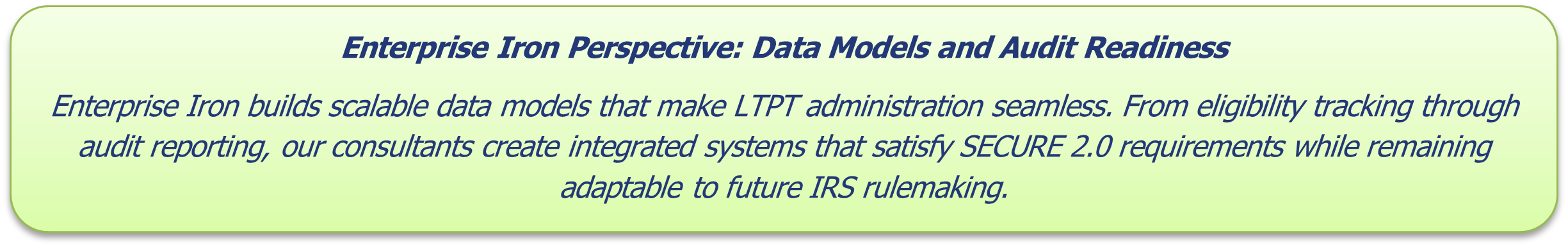 Enterprise Iron brings deep expertise in retirement plan operations, systems integration, and compliance architecture. We help our clients implement LTPT capabilities efficiently, mapping regulatory requirements to functional processes, strengthening data integrity, and preparing for the next phase of IRS guidance in 2026 and beyond.