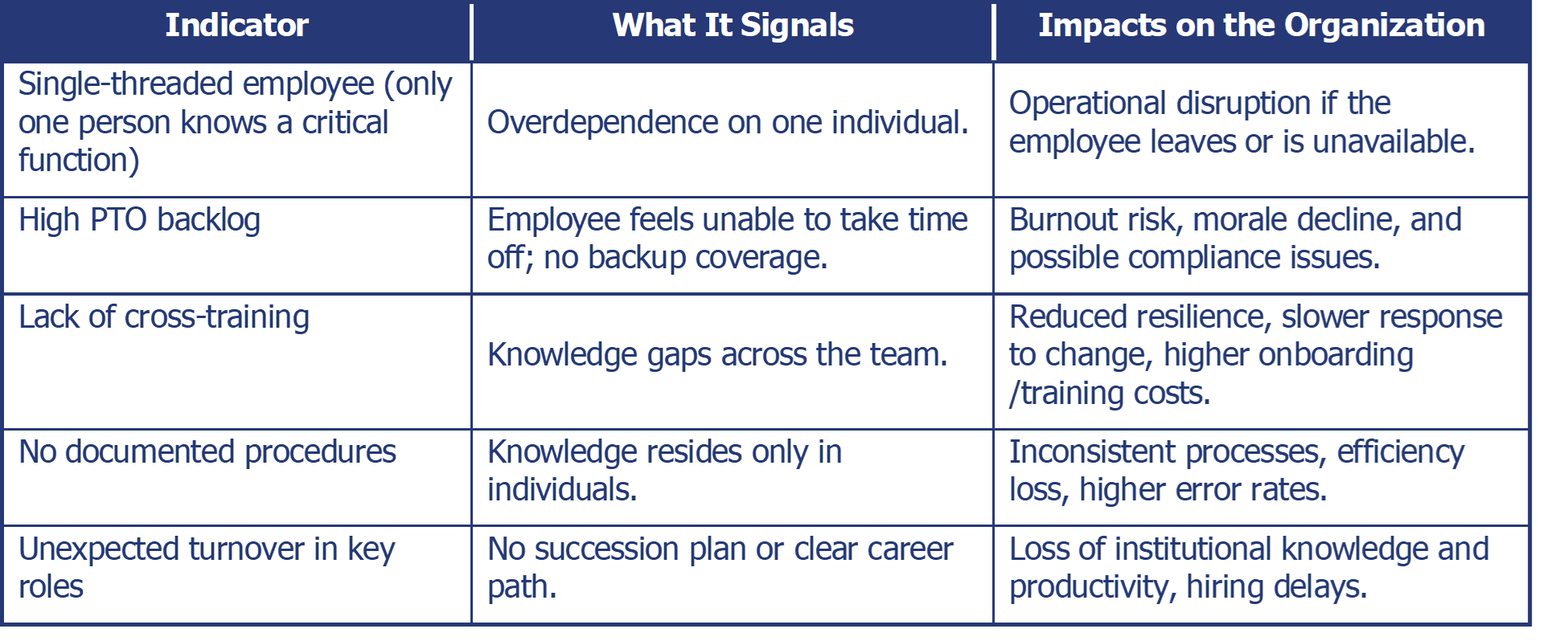 To better understand where organizational vulnerabilities may exist, the following table highlights key indicators of insufficient succession planning and their potential impacts.